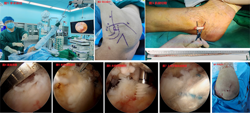 图2 手术过程:侧卧位-取自体腓骨长肌-关节镜下完成置钉-自体肌腱导入“W五点固定”。