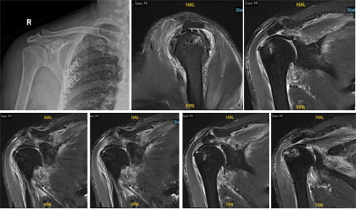 图1 术前影像学资料:69岁,男性,巨大不可修复性肩袖损伤;Hamada分型3型、Goutallier分级3级。