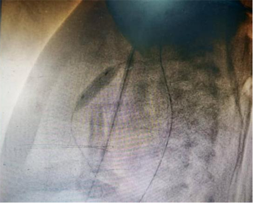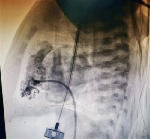 图中为肺动脉球囊扩张即刻,狭窄腰征消失,达到有效扩张
